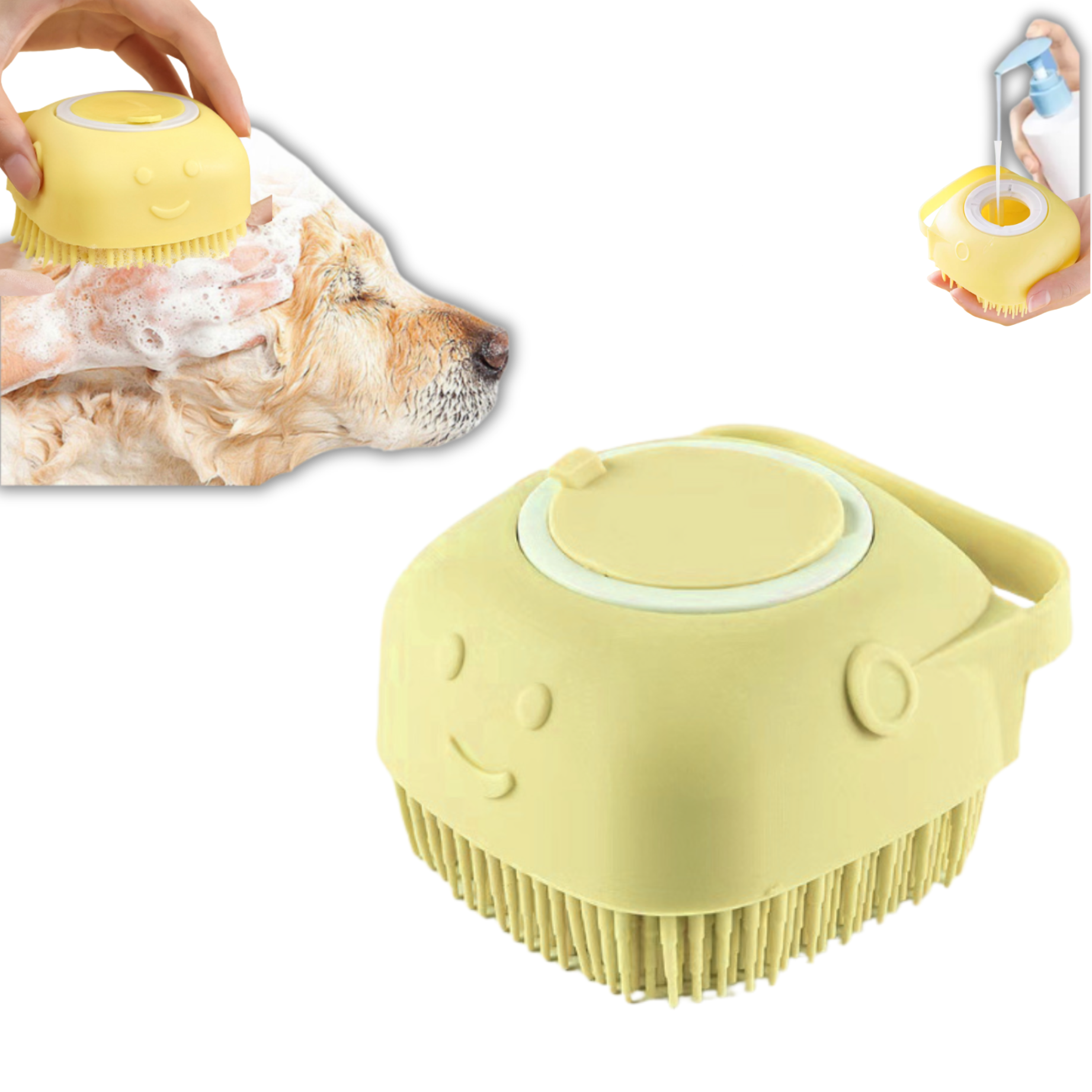 Szczotka do mycia sierści dla psa, kota, królika z dozownikiem na szampon - żółta